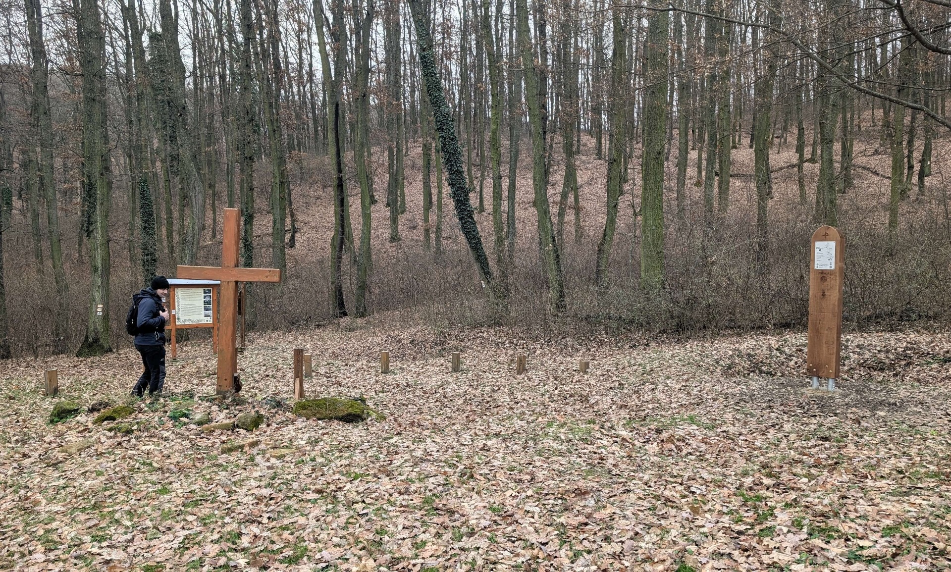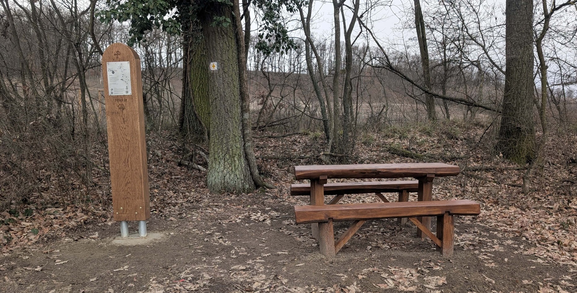 Miután kibámészkodtuk magunkat, tovább sétálunk a kerítés mellett, majd jobbra felmászunk utunk utolsó erdei dombján. Elérjük a kilencedik megállónkat, amely Mészkemence névre hallgat. Akár pihenőt is tarthatunk itt, hiszen kényelmes pad vár ránk. Érdemes kitérni az ösvény szélére, innen is szép panoráma a jutalmunk.