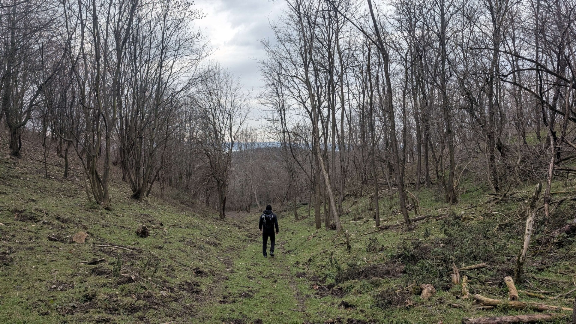 Ahogy folytatjuk utunkat, pár méterre bemegyünk a fák közé, majd egy jókora völgybe térünk át - körülbelül 110 métert ereszkedünk 750 méteren. Nyirkos, csapadékos időben vagy eső után legyünk fokozottan figyelmesek, mert a talaj saras és csúszik. Ottjártunkkor csöpögött az eső, lépéseinkre figyelnünk kellett és cipőink talpán jókora madárfészkek is keletkeztek. De megérte, mert ahogy pingvin módjára letotyogtunk a magas falakkal körülvett völgybe, három szarvasbika szaladt át előttünk.